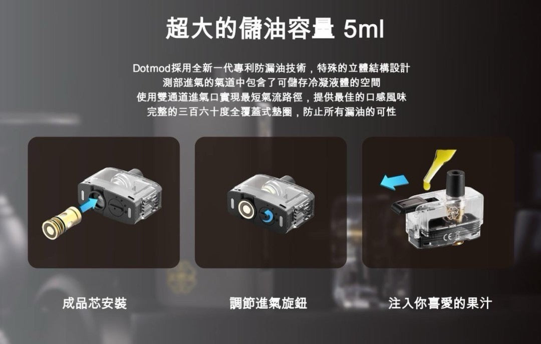 兼容多款設備,Pod空煙彈0.6 、1.0 ,另外提供支援 Dot AIO Coil 0.3、0.7 和 0.9 歐姆成品芯版可替換空倉(需另購),滿足不同口感偏好,更不怕耗材缺貨空窗期!