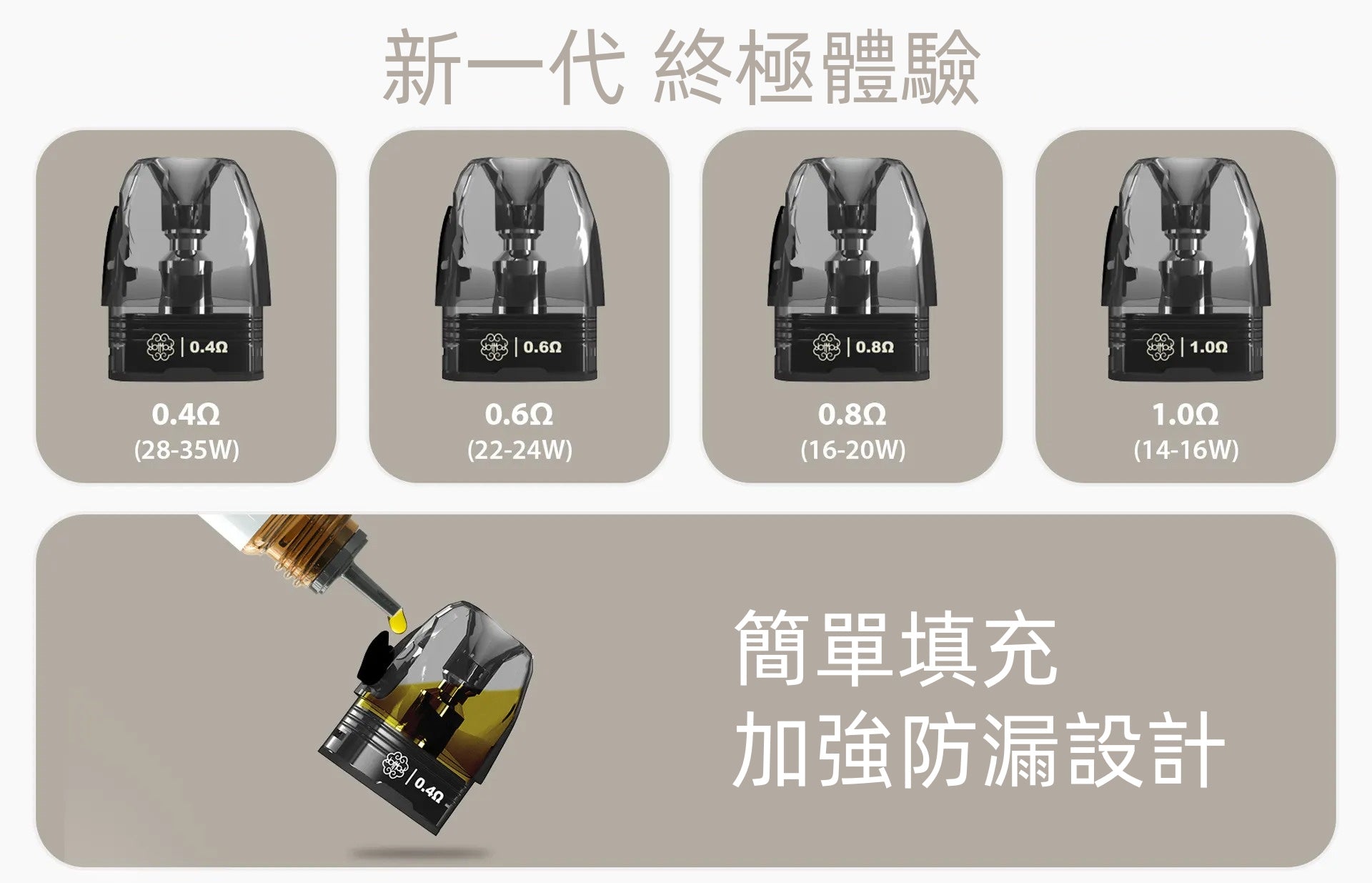 ✦四種阻值選擇(0.4Ω / 0.6Ω / 0.8Ω / 1.0Ω),適配不同霧化風格。