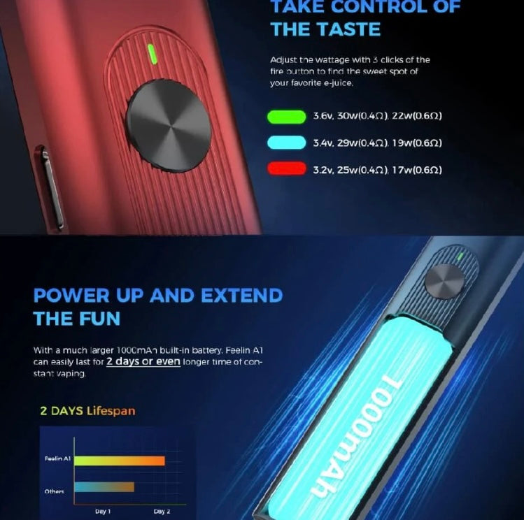 內建1000毫安時的電池更大。 Feelin A1可以很容易地持續2天甚至更長時間的持續電子煙。