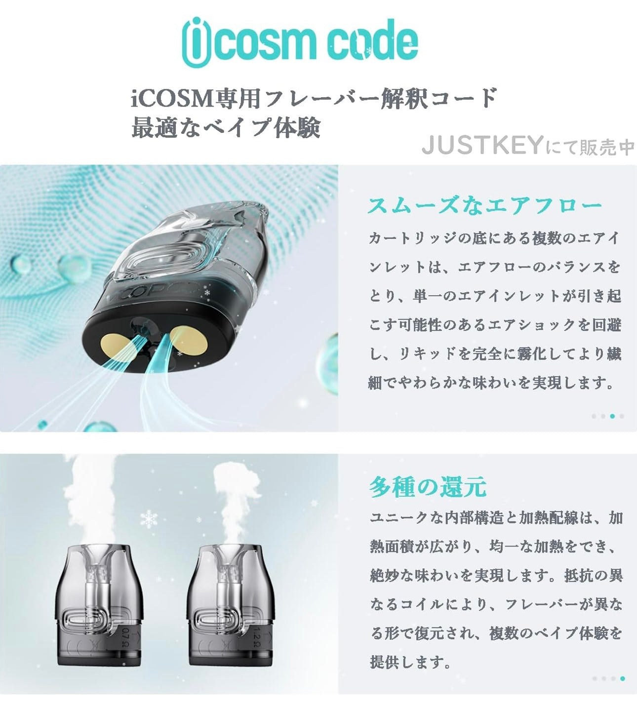它的iCOSM Flavor Interpretation Code 確保每一口煙都能帶來新鮮和美妙的體驗,減少了漏油的問題,並且延長了油的鮮味保持時間 。